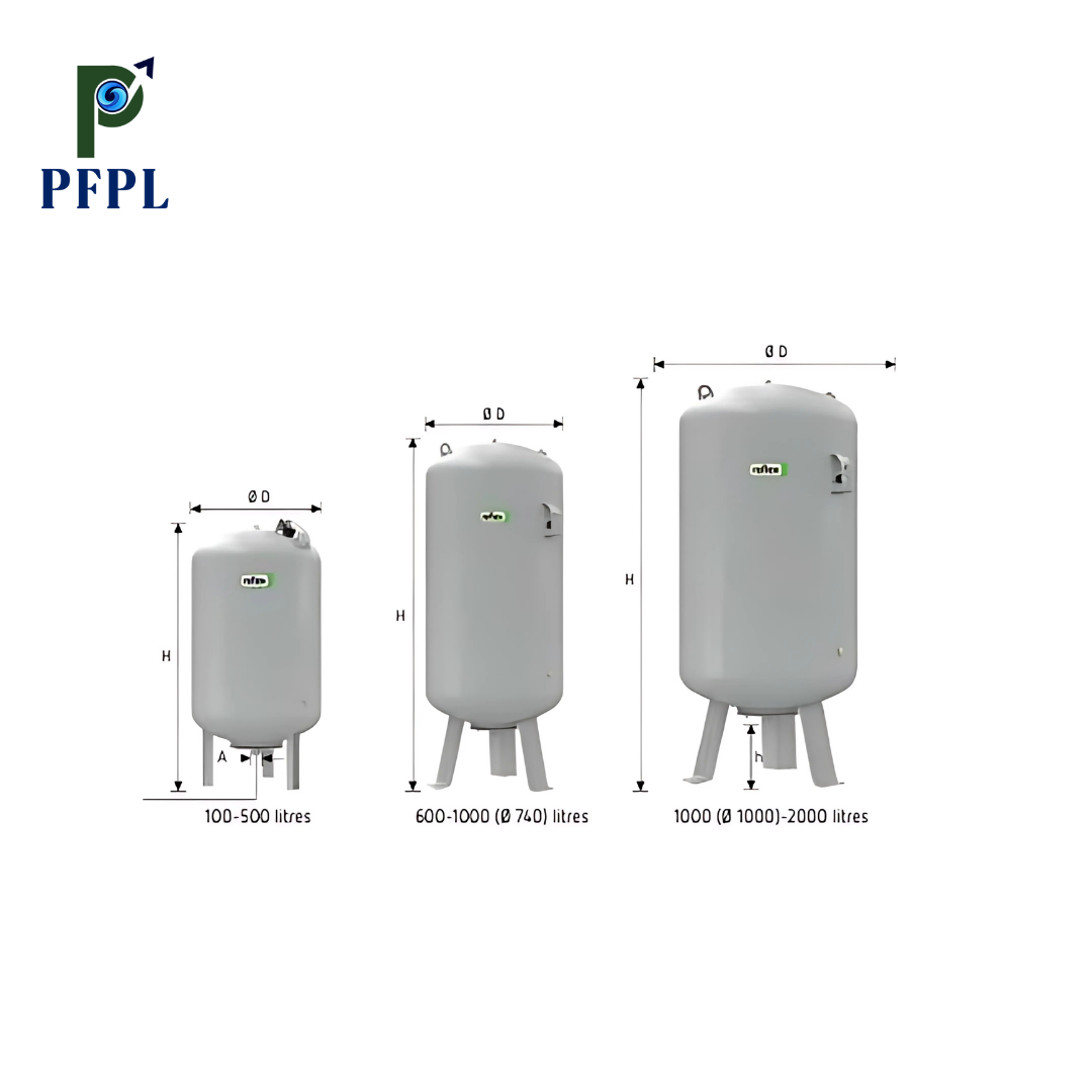 Reflex G vessels are available with threaded connections up to 1,000 litres (Ø 740 mm) and flanged connections from 1,000 litres (Ø 1,000 mm), with models ranging from 3,000 to 10,000 litres featuring an upper flange. Units above 1,000 litres include a Ø 1,000 mm inspection opening. Each vessel is equipped with a replaceable bladder compliant with DIN EN 13831/3 and supports anti-freeze additives with concentrations between 25% and 50%. Engineered for reliability, the system includes a factory-mounted pressure gauge, lifting lugs and a pre-pressurised nitrogen gas chamber. It is finished with a durable epoxy resin coating and meets or exceeds EU Pressure Equipment Directive 2014/68/EU standards. The vessels are rated for a maximum system temperature of 120°C and a bladder operating temperature of up to 70°C.