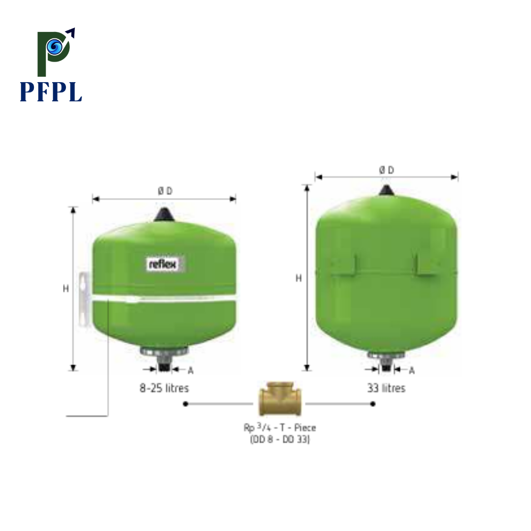 Refix DC is vessel features threaded connections and corrosion-resistant components in contact with water. It includes a non-replaceable diaphragm compliant with DIN EN 13831/3, supporting a maximum operating temperature of 70°C. The vessel meets or exceeds the requirements of Pressure Equipment Directive 2014/68/EU and is finished with a durable epoxy resin coating. Additional features include a factory pre-pressurised nitrogen gas chamber and lifting lugs for ease of handling.